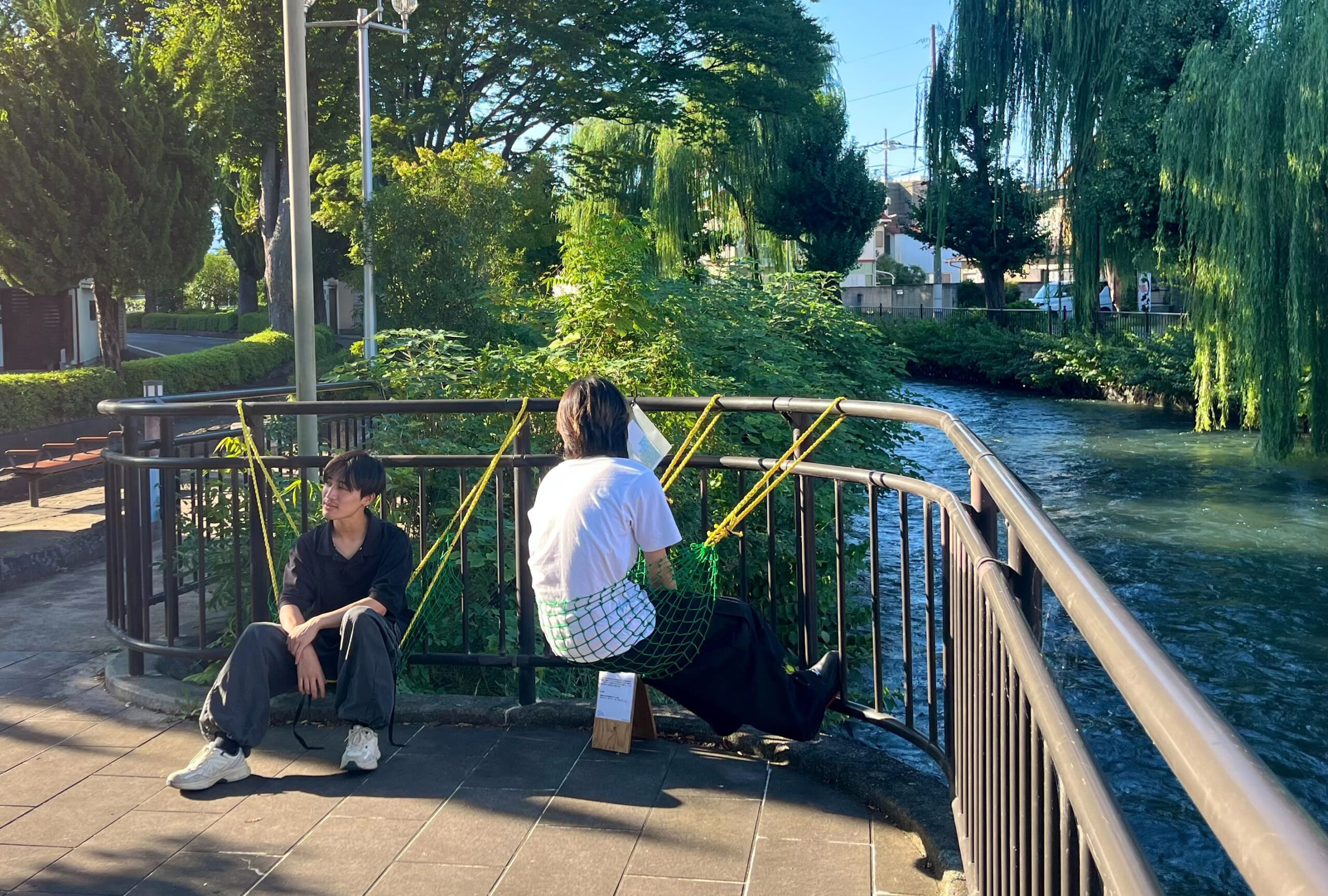 作品概要文:力強くあり続ける木や川の風景の中に、1つの居場所を作る。前橋のイメージに合う黄色のロープを三つ編みにし、