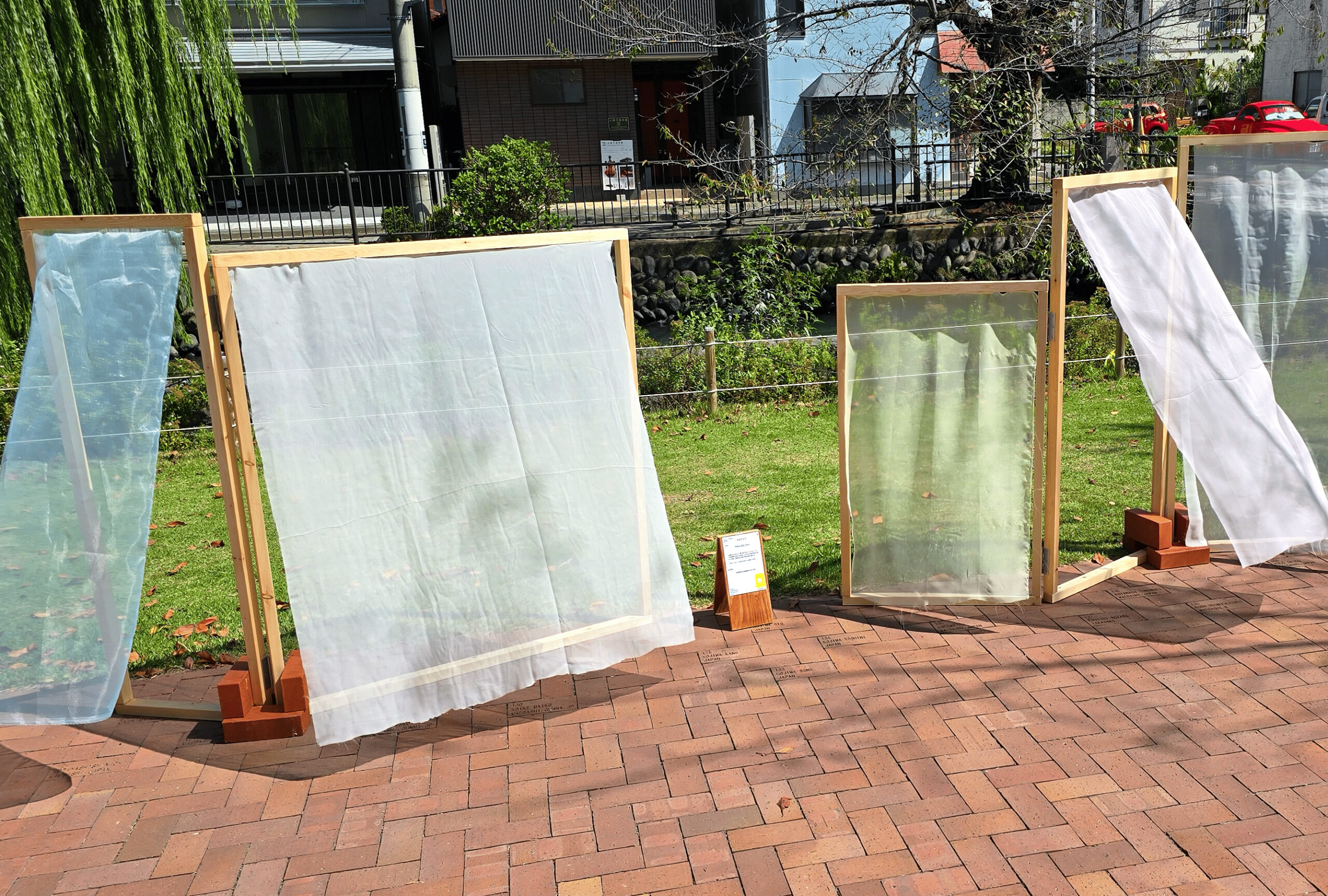 作品概要文:広瀬川の川沿いに、風に舞う色とりどりのカーテン。その隙間から見えるのは、いつもとは違う色彩に満ちた世界。