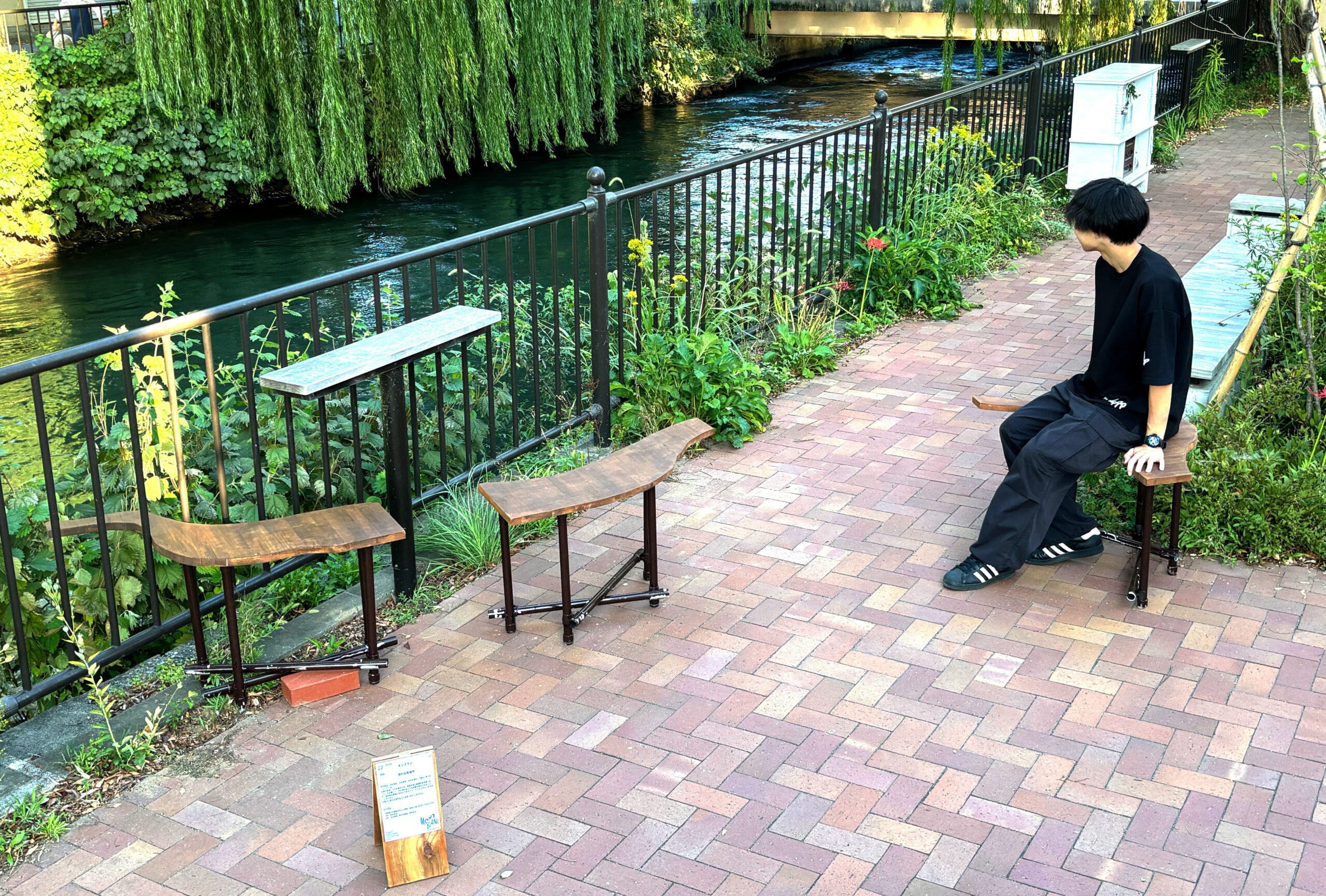 フェンスを越して、川の流れるような曲線を取り入れることで、境界線が曖昧になるようなストリートファニチャーを作ることができた。
