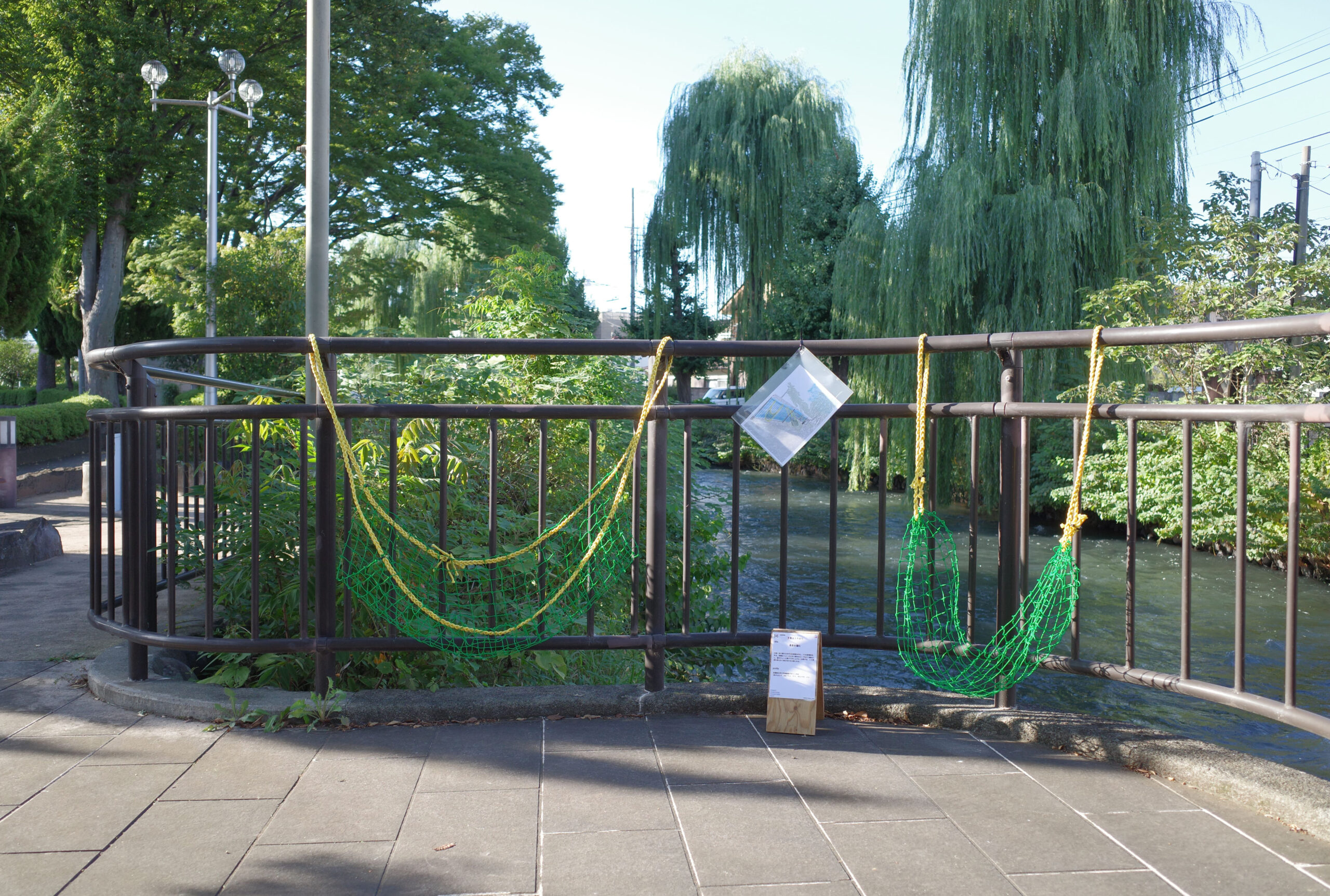 作品概要文:力強くあり続ける木や川の風景の中に、1つの居場所を作る。前橋のイメージに合う黄色のロープを三つ編みにし、